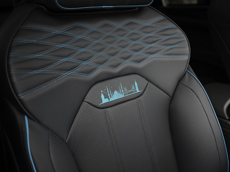 Renk teması, her bir aracın iç mekanında da devam ediyor. Koltuk başlıkları ve arka minderlere işlenen Turkuaz Mavisi “İstanbul Silüeti” detayları, Kız Kulesi, Galata Kulesi ve İstanbul Boğazı üzerindeki köprüleri içeriyor. Bu detaylar, Sultanahmet Camii‘nin berrak mavi desenli çinilerinden ilham alınarak lacivert ve siyah deriyle kaplanıyor.